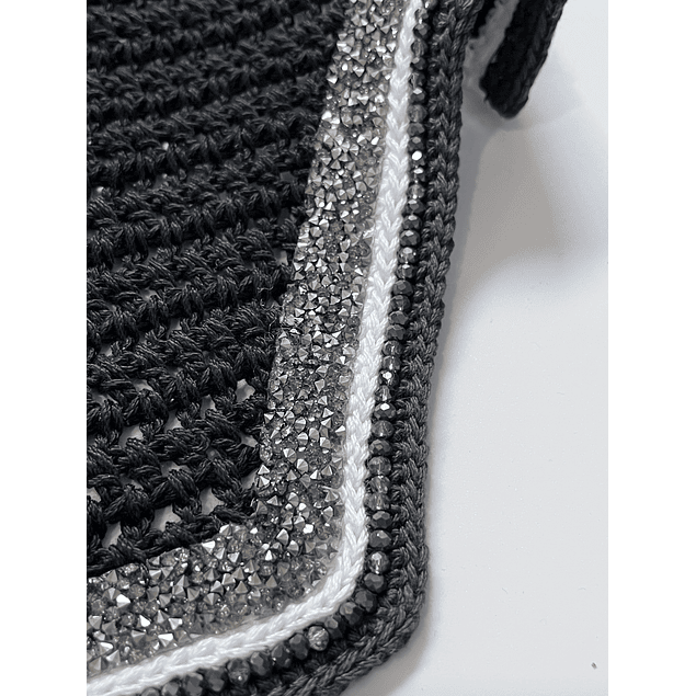 Regular size black square horse fly bonnet. Smoke charcoal rhinestone ribbon, white trim, smoke crystals with charcoal trim. Regular horse size stretch ears.